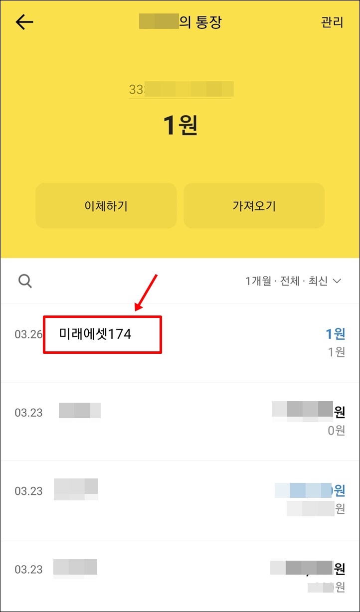 7. 카카오뱅크에 내 계좌에 가면 '미래에셋XXX' 으로 1원이 입금되어있습니다.