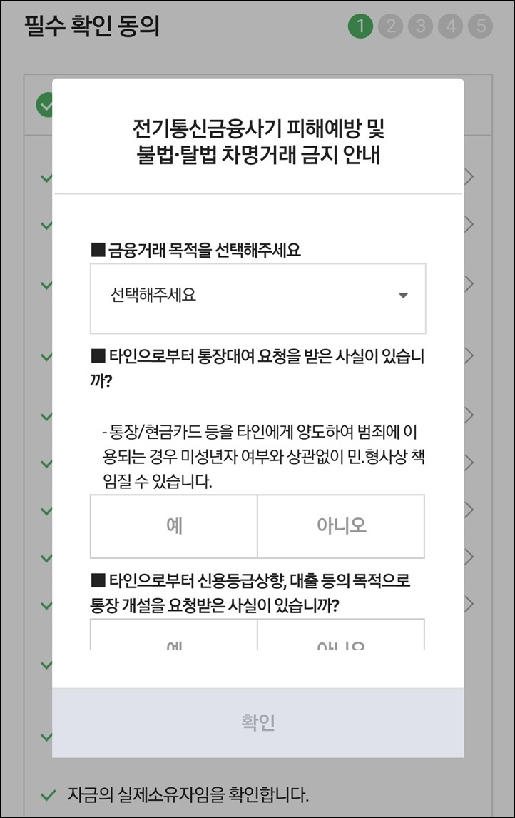 3. 네이버통장 개설 전 신분확인을 하고 약관 동의와 금융거래 목적 및 금융사기 피해예방 위한 설문을 거쳐야 합니다.