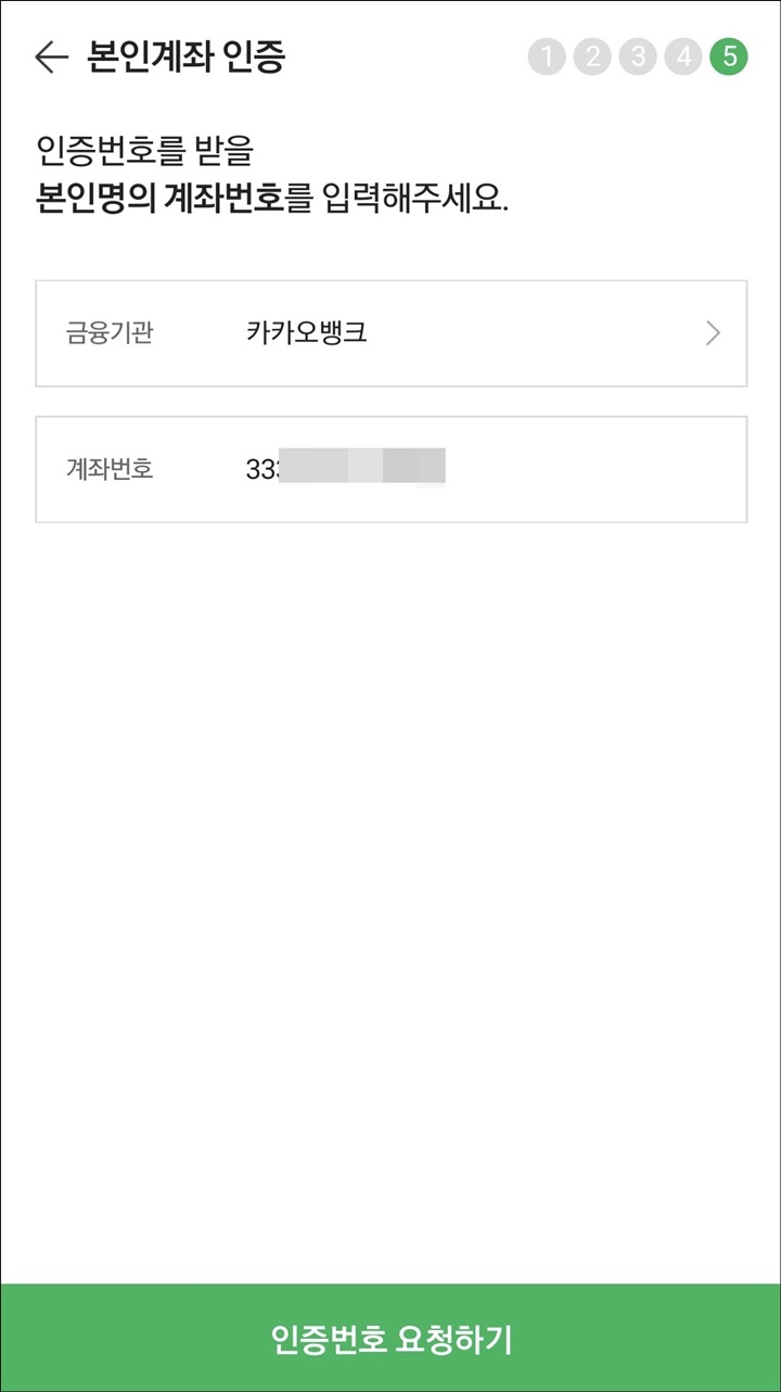 6. 인증번호를 받을 본인 명의 계좌번호를 입력합니다. 저는 카카오뱅크 계좌를 연결했습니다.