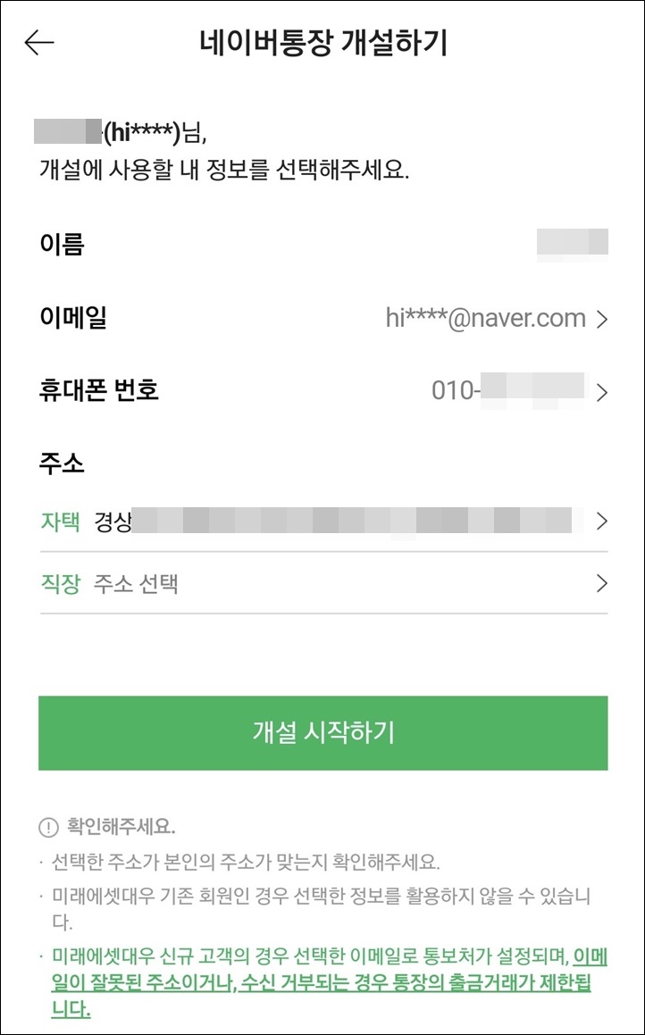아래부터는 네이버통장 미래에셋 CMA통장 개설하는 과정입니다.