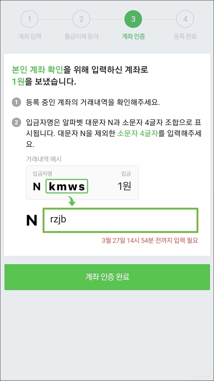 4. 카카오뱅크 계좌에 가면 네이버로부터 온 인증 문자가 있습니다. 'Nrzjb' 중 소문자 4자리를 입력하면 계좌 인증이 완료됩니다.