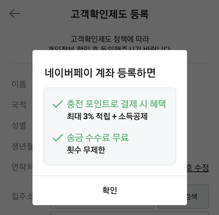 (또는 네이버페이 간편 결제의 계좌 등록)