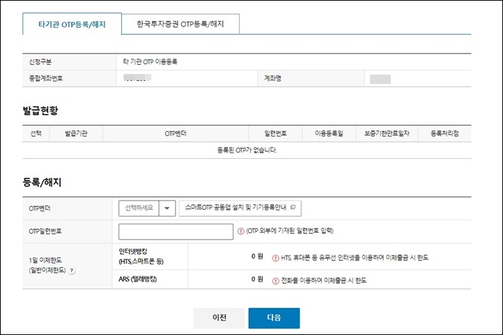 6. 다음 화면으로 넘어가면서 증권사 영업점에서 발급받은 OTP 기기를 꺼내서 OTP벤더, OTP일련번호를 입력합니다. OTP기기의 뒷면의 내용을 참조합니다.