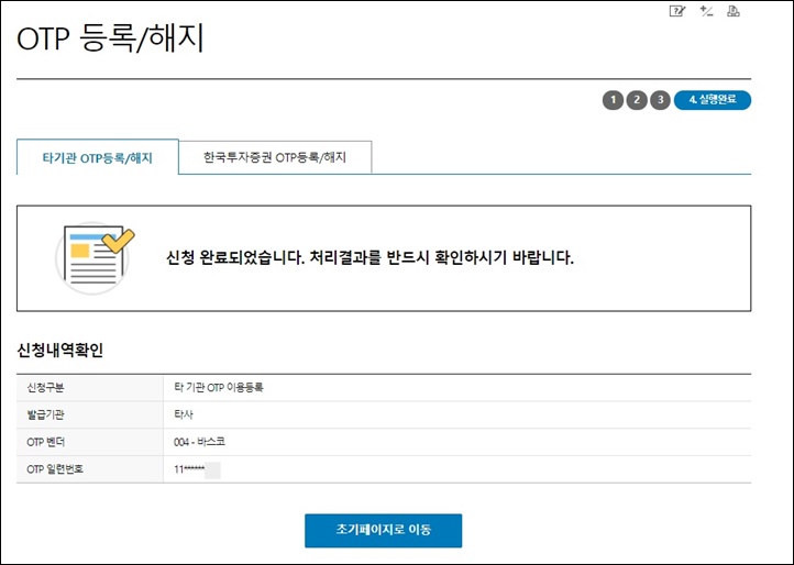 9. '신청 완료되었습니다. 처리결과를 반드시 확인하시기 바랍니다'라는 메시지를 확인하셨으면 한국투자증권에 아이의 타 금융기관 OTP 등록이 완료된 것입니다.