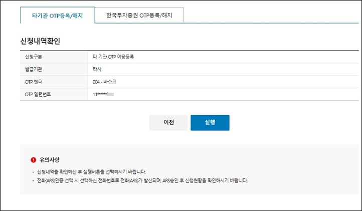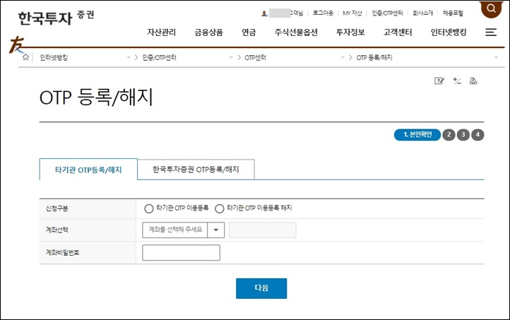 4. 한국투자증권 友의 사이트가 나타나면서 'OTP 등록/해지' 화면이 뜹니다.