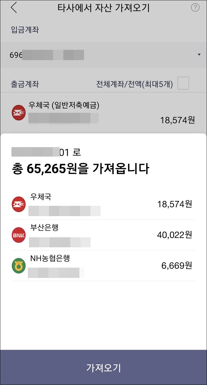 한국투자증권에서 주로 매도매수하기 때문에 한국투자증권 앱에서 자산 가져오기 기능을 사용하였는데 이를 오픈뱅킹 메뉴에서 할 수 있습니다. 자산을 가져올 때 모든 은행과 증권사에서 출금에 동의한 것은 아닙니다. 출금 동의를 해준 은행에서만 자투리 돈을 모았습니다. 증권사 같은 경우엔 출금동의에 실패할 수 있습니다.