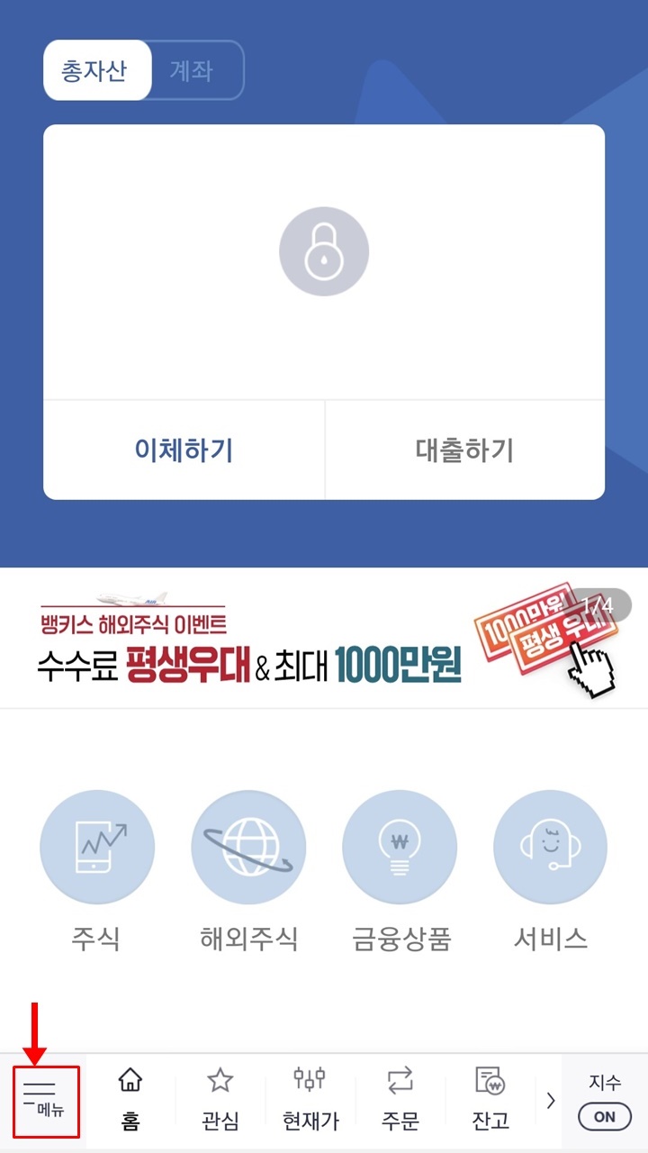 1. 메뉴 화면에서 상단 '계좌/서비스' 를 선택합니다.