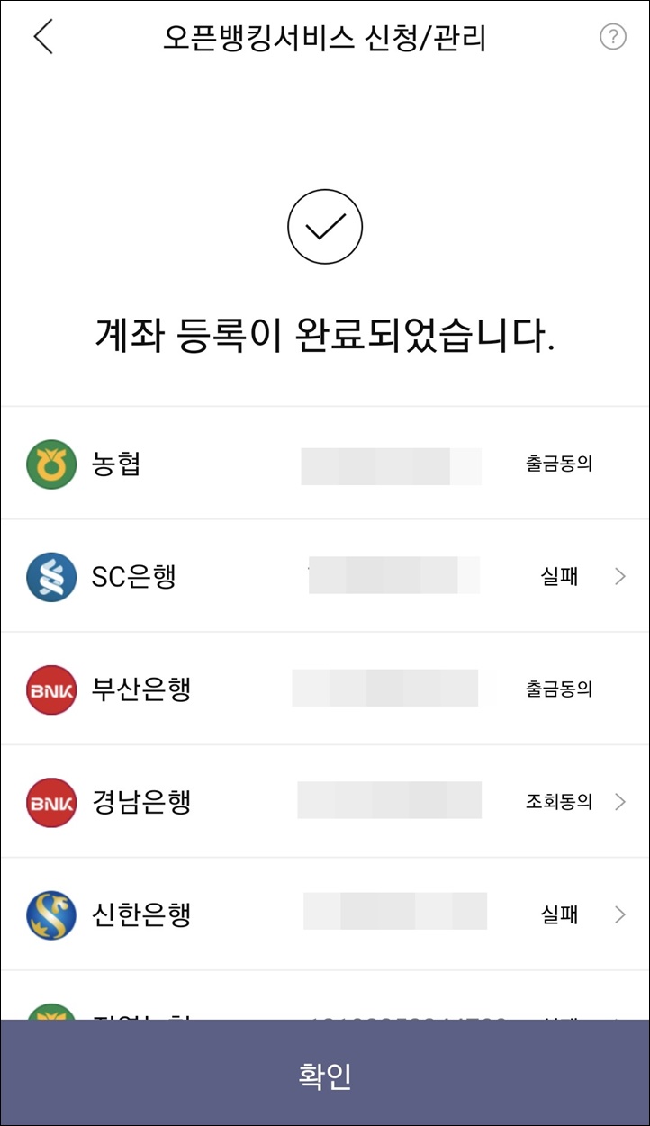 9. '오픈뱅킹 > 오픈뱅킹서비스 신청/관리' 화면에 가시면 등록한 타사 자산 계좌 목록을 조회할 수 있습니다.