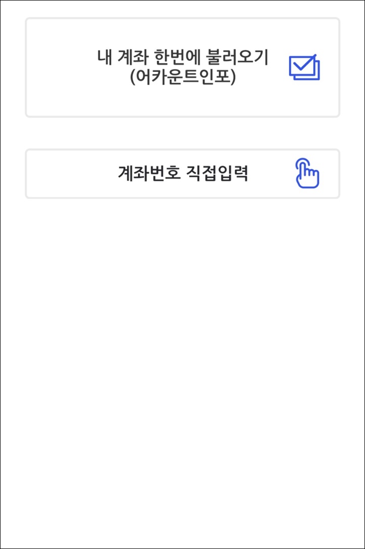 5. 두 가지 메뉴를 선택할 수 있습니다. '내 계좌 한번에 불러오기'와 '계좌번호 직접 입력' 하기가 있습니다. 저는 과거 계좌를 모르기 때문에 한 번에 불러오기 기능을 사용하였습니다.