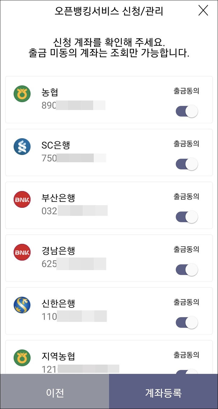4. 아래 '계좌추가' 버튼을 선택합니다. 그러면 오픈뱅킹 서비스 등록을 위한 약관 동의가 나오고 그다음 휴대폰 인증을 거쳐야 합니다.