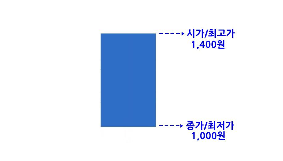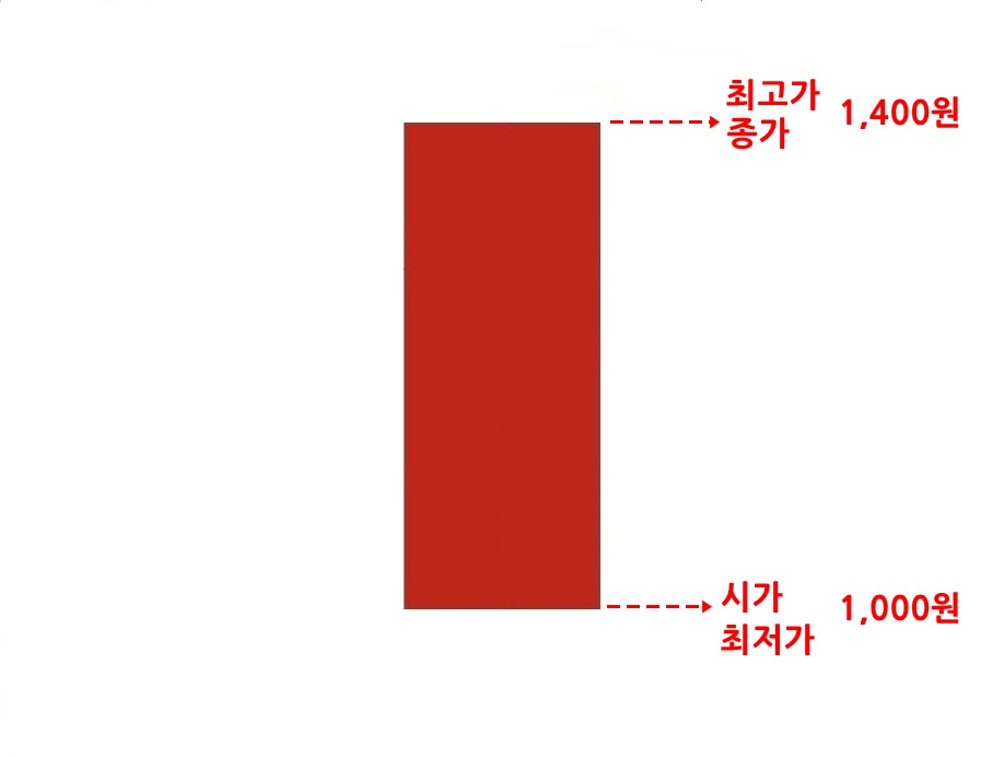 장대음봉 시가 1,400원으로 시작해서 종가 1,000원으로 끝났는데 시가와 최고가, 그리고 종가와 최저가가 같습니다.
