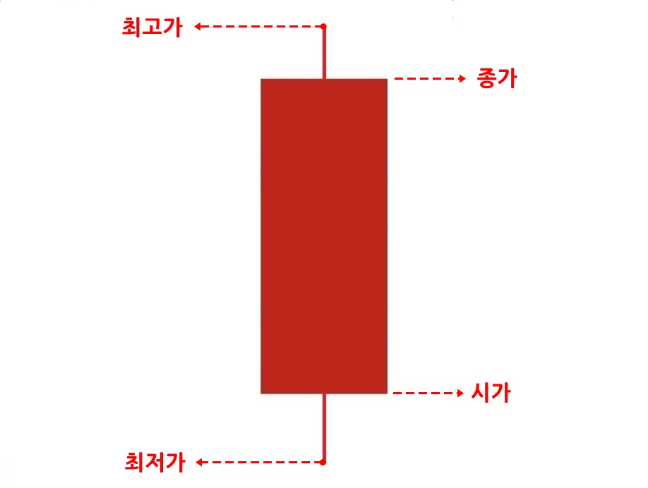 주식차트에서 빨간 막대를 양봉이라 부릅니다. 양봉은 시가와 종가를 나타내는데 시가는 거래시작 가격을 말하고 종가는 거래종료 가격을 말합니다. 그리고 막대기가 꽂혀 있는데 맨 위 꼭지를 최고가라하고 맨 아래 꼭지를 최저가라합니다.